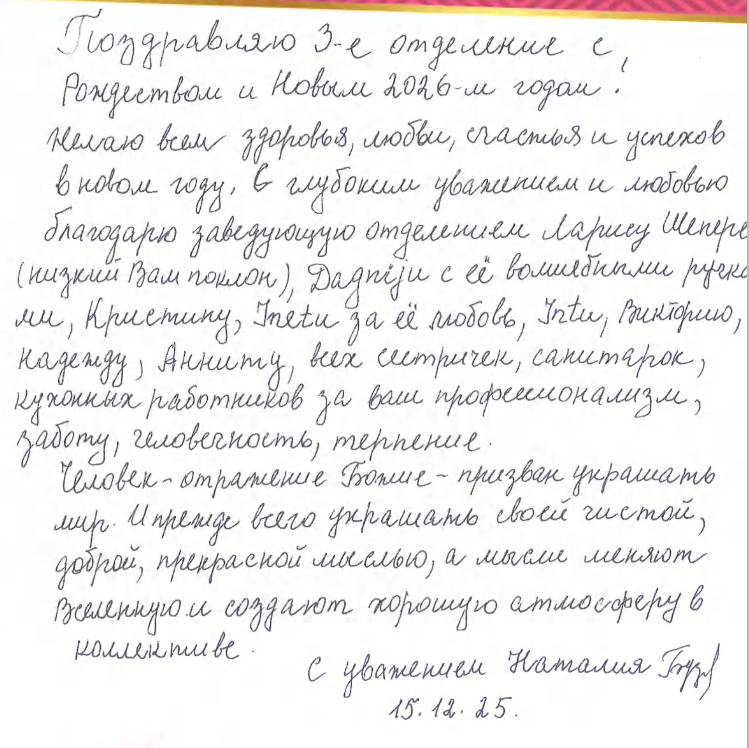Sirsnīgs paldies stacionāra Tuberkolozes un plaušu slimību centrs Tuberkulozes un pleiras slimību nodaļas personālam par uzmanīgo attieksmi, labestību un cilvēciskumu.