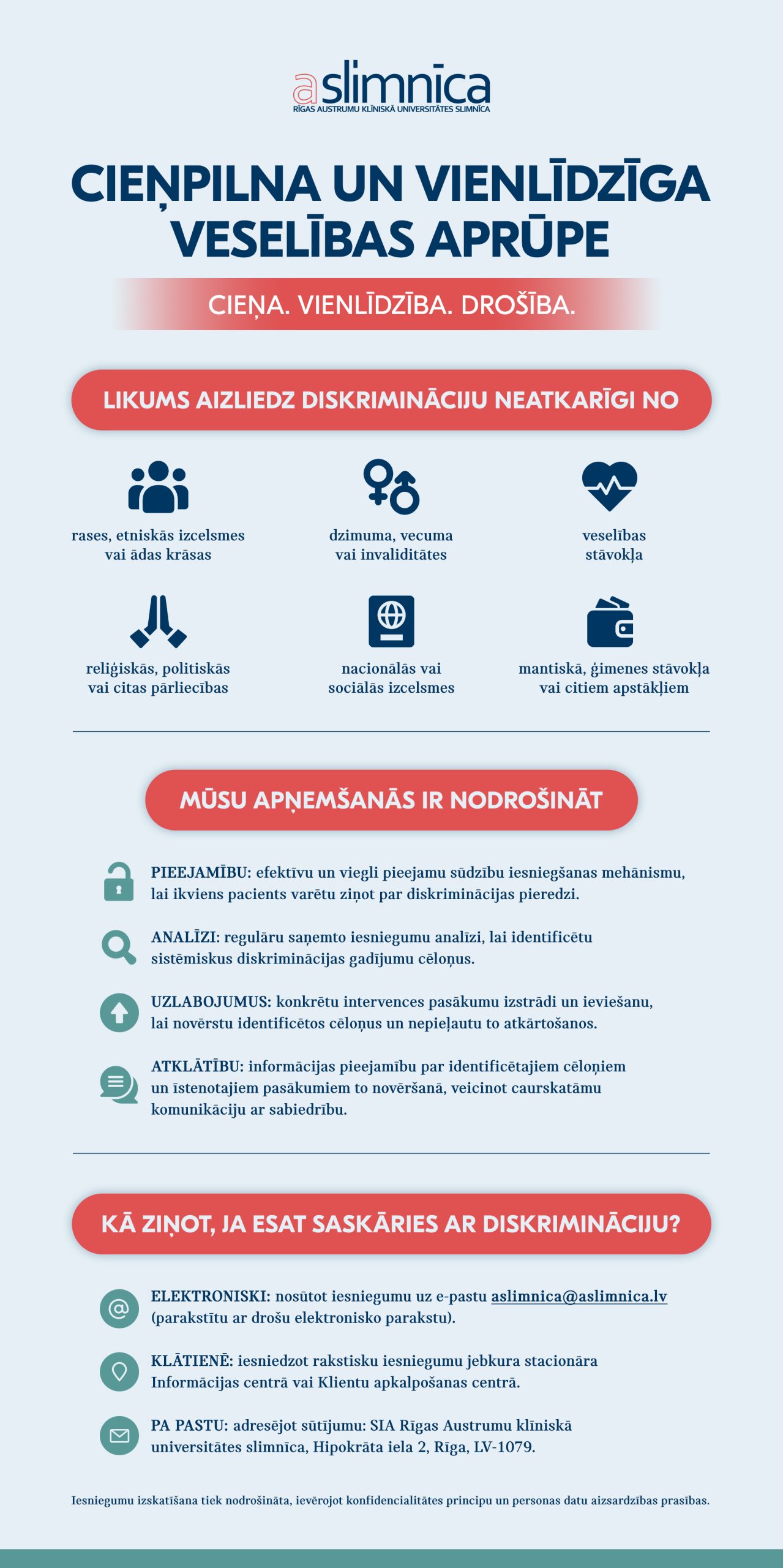 Ja pacienti uzskata, ka ir piedzīvojuši kādu no šiem diskriminācijas veidiem, aicināti sūtīt iesniegumu uz aslimnica@aslimnica.lv vai klātienē iesniegt rakstisku iesniegumu jebkurā no Austrumu slimnīcas Klientu apkalpošanas centriem. Ziņot drīkst arī anonīmi. Konfidencialitāte tiks nodrošināta.
