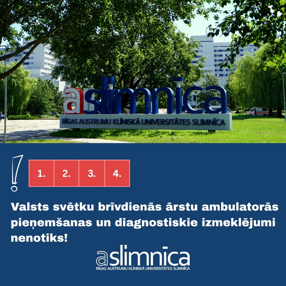 Valsts noteiktajās svētku brīvdienās – Darba svētkos un Satversmes sapulces sasaukšanas dienā 1.maijā un Latvijas Republikas Neatkarības atjaunošanas dienā 4.maijā, Rīgas Austrumu klīniskās universitātes slimnīcas (Austrumu slimnīca) stacionāros nenotiks ārstu ambulatorās pieņemšanas un diagnostiskie izmeklējumi. Šajās dienās zvanus nepieņems arī vienotais pieraksta tālrunis +371 67000610.